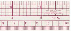 Transparent combo ruler with both an 8ths graph and 16ths to the inch calibrations plus zero centering scale. The other edge has millimeters numbered in centimeters. Laminated for durability. 1″ x 12″. Red markings.