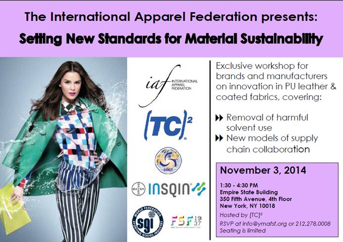 I wanted to make you aware of a workshop that we are conducting in conjunction with the International Apparel Federation (IAF) and the YMA Fashion Scholarship Fund. Please make plans to attend the 3-hour workshop titled “Setting New Standards for Material Sustainability” next Monday at the Empire State Building. Seating is limited, but we do have some seats still available.